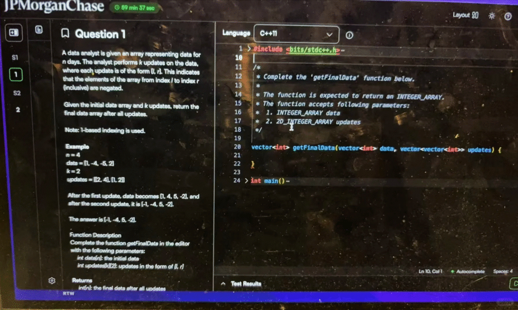 上个月底投了 JP 的 26 Summer Intern,简历刚过没多久就收到了 OA。整体节奏挺快,平台是 HackerRank,两道 coding,时间给得也不算紧。我这场大概 20 分钟左右就写完 + 自测通过,整体难度偏基础,偏思维清晰度,不太卡实现细节。下面简单复盘一下 JPMorgan Chase 2026 Summer Intern OA 题型和思路,给后面要做的同学一个参考。